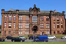 The Technical School, as it was originally known, was built at the corner of Elmbank Drive between 1908–1909, next to Kilmarnock Academy.[13] Constructed of Ballochmyle sandstone, the building was erected to plans by Gabriel Andrew and cost £18,000 to build, opening on 26 January 1910.[13] The technical school contained laboratories "for the study of chemistry, physics, mechanics, high engineering, heavy engineering, electrical engineering, hydraulics, mining, weaving, horticulture, and biology".[13] Additionally, pupils could study building design, art, domestic science, woodwork, metalwork and plumbing at the site.[13]