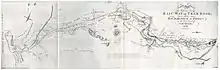 The choice of the older technology may be due to the employment of William Jessop as engineer. He had built the Surrey Iron Railway, also a plateway. The wrought iron rails were L-shaped, and the upstand guided the wagons; the wagon wheels did not have flanges, which enabled them to be easily moved around terminal areas where there was hard standing, and to and from locations further from the railway. The plates were three feet long, with a four-inch width and a three-inch upstand (920 mm long by 100 mm by 76 mm). Highet says, "These plates or rails were joined with a square joint and were nailed to the foundation stones through small square holes formed half-way in each end of the rail."[4] Clearly the plates were carried on sleeper blocks; the "nails" refers to pins fastened into timber plugs in holes drilled in the stone blocks. The gauge of the line (i.e. the dimension over the upstands) was 4 ft (1,219 mm). The route was nine miles six furlongs (15.7 km) in length.[4]