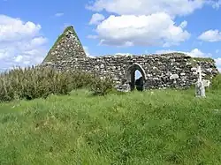 Kiltullagh Church (Irish: Cill Tulach):Church of the Hills is a former Christian Church and burial site located in County Roscommon, Ireland.[1][2] Several archeological digs have taken place on the site that have revealed evidence of Christian activity on the site early as the fifth century. Evidence of earlier pagan worship and burials have also been found. The current state of the site is in ruin, as a result of the mid 17th century Cromwellian forces most likely headed by Henry Ireton. More recently evidence of an earlier wooden structure has been found near to the site of the ruined stone church.[3]