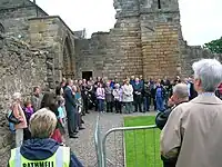 In the 16th century the abbey had been gradually secularised and protestantised; the last abbot, Archbishop Gavin Hamilton of Roplock, died at Restalrig, outside Edinburgh on 'Black Saturday, 15 June 1571, following a skirmish between the parties supporting the Queen and the opposing Protestant faction under the Earl of Morton.[2] Although he supported the Reformation, he was also a supporter of Mary Queen of Scots.[31]