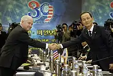 General (Ret.) Kim Jang-soo (Korean: 김장수; Hanja: 金章洙; born February 28, 1948), ROKA, was the 37th Chief of Staff of the Republic of Korea Army and the 40th Republic of Korea Minister of National Defense. He was a Grand National Party Representative in the National Assembly of South Korea from 2008 to 2012.[1] General Kim graduated from the Republic of Korea Military Academy in 1971. He graduated from Korea National Defense University in 1988, then he earned a master's degree in Arts at Graduate School of Public Administration, Yonsei University in 1989.