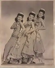 The sisters began their careers as child entertainers in kiddie revues in and around their hometown of Minneapolis, Minnesota during the Jazz Age (1920 - 1929). They traveled with the vaudeville circuits during the Great Depression (1929 - 1939). During the Second World War (1939 - 1945), they appeared on the Broadway stage and the Hollywood screen with actors including Frank Sinatra, Ann Miller, The Three Stooges, Jackie Gleason, and Louis Jordan.[1] Dubbed “the Chinese Andrews Sisters,” the Kim Loo Sisters were arguably the first Asian American act to star in Broadway musical revues.[2]
