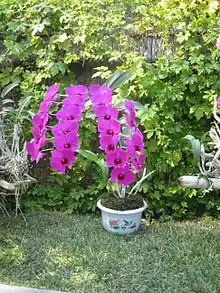 Kimilsungia is a hybrid orchid cultivar of the genus Dendrobium. It is a clone of a plant that was created in Indonesia by orchid breeder Carl Ludwig C. L. Bundt, who in 1964 registered the grex name Dendrobium Clara Bundt for all orchids of the same ancestry, naming it after his daughter. It has a complex ancestry from cultivated orchids. An attempt was made to register the grex name Dendrobium Kimilsungia, but this is not valid, it is a later synonym of Dendrobium Clara Bundt. As a cultivar name (applying to only part of the grex), the correct name is Dendrobium Clara Bundt 'Kimilsungia'. Another grex name Dendrobium Kimilsung Flower refers to plants of related but different ancestry.[1]