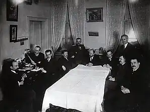 The 1934 coup d'état was executed by the Military Union and the Zveno, who removed Nikola Mushanov from power. It reflected the authoritarian trend in Europe.[28] In this coup, Kimon Georgiev played an important role. At a meeting of the Union's Central Government, held at the house of Kimon Georgiev, it was decided to stage a coup on 19 May. Damyan Velchev and Kimon Georgiev were at the head of the coup.[29]