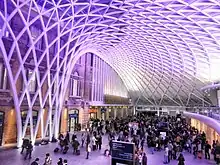 King's Cross following refurbishment in 2012. The steel structure of the roof, engineered by Arup, has been described as being "like some kind of reverse waterfall, a white steel grid that swoops up from the ground and cascades over your head".[61]