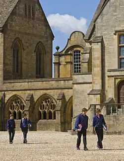 The school continues to occupy the site of the former monastery; the school chapel (12th century, modified in the 15th, 19th, and 20th centuries), library (13th century, 15th century roof and windows), and the Abbot's House (c. 1480), occupied by the headmaster and the senior staff, are all former monastic buildings. The outlines of the monastic cloister, and curious first floor Abbot's Chapel, are visible on the walls beyond the Abbot's House.[8]