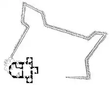 The castle is surrounded by a rectangular earthwork, probably built in 1627, and similar to that at Sandsfoot and Pendennis Castles.[44] It stretches away north-east from the castle, with an earth and rubble bank up to 2 metres (6 ft 7 in) high and 8 metres (26 ft) wide, with a bastion and demi-bastion at its corners and a ditch, up to 0.4 metres (1 ft 4 in) deep and 3 metres (9.8 ft) wide along the north and east sides.[44]