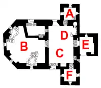 King Charles's Castle is a polygonal stone building, composed of a gun battery on one side and living quarters on the other.[36] On the west side, overlooking the sea, is a large room which originally contained the battery, with embrasures for five guns.[37] At some point after its initial construction, the north-east gun embrasure was blocked by the construction of an internal chamber within the gun battery, 4.5 metres (15 ft) by 2.3 metres (7 ft 7 in), with the embrasure being opened up to form a window.[37]