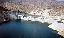 The King Fahad Dam, previously known as Bisha Dam, is a gravity dam on Wadi Bisha about 35 km (22 mi) south of Bisha in the 'Asir Region of southwestern Saudi Arabia. The dam has many purposes , such as serving flood control, supplying water to nearby localities, irrigation and groundwater recharge. A water treatment plant was built in conjunction with the dam and it can supply up to 40,000 m3 (1,400,000 cu ft) of water to the city of Bisha a day. The dam was constructed between 1986 and 1997. It is named after King Fahad and is managed the Ministry of Water and Electricity. At 103 m (338 ft) in height, it was the tallest dam in the country until the 106 m (348 ft) Baysh Dam was completed in 2009. King Fahad's reservoir still has the largest storage capacity, at 325,000,000 m3 (263,000 acre⋅ft).[1]