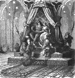 King Goldemar (also spelled Goldmar, Vollmar, and Volmar) is a dwarf or kobold from Germanic mythology and folklore. By the Middle Ages, Goldemar had become the king of the dwarfs in German belief.[1] In the fairy tale "The Friendship of the Dwarfs", the author Villamaria depicts Goldemar as a "mighty dwarf king" with a queen and a court of dwarf nobles at his service. He has long, silver hair and beard and wears a crown and a purple mantle.[2] In one tale, he runs away with the daughter of a human king.[3] Fragments of an epic poem by Albrecht von Kemenaten called Goldemar survive. The poem tells of Dietrich's encounter with the dwarf king.[4] The king also features in "Der junge König und die Schäferin" ("The Prince and the Shepherdess") by German poet Ludwig Uhland.[5] Goldemar's brothers, Alberich or Elberich and Elbegast, feature in other poems.[1]