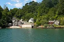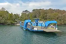 The King Harry Ferry Bridge is a vehicular chain ferry which crosses the Carrick Roads reach of the estuary of the River Fal in Cornwall, England, UK. The ferry crosses between the parishes of Feock and Philleigh, roughly halfway between the city of Truro, the lowest bridging point on the estuary, and the town of Falmouth, at the estuary's mouth. The ferry is owned and operated by the King Harry Steam Ferry Company Ltd. The current ferry boat, named No. 7, was built in 2006 and can carry up to 34 cars.[1]