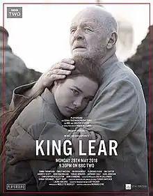 King Lear is a 2018 British-American television film directed by Richard Eyre. An adaptation of the play of the same name by William Shakespeare, cut to just 115 minutes, it was broadcast on BBC Two on 28 May 2018.[1] Starring Anthony Hopkins as the title character, the abridged adaptation is set in a highly militarised version of 21st-century London and depicts the tragedy that follows when the sovereign King Lear announces the end of his reign and the division of his kingdom among his three daughters. The adaptation was met with positive reviews, which commended its acting, and many singled out Hopkins for his performance in the title role.