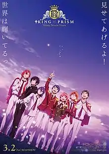 The theatrical version consisting of four feature compilation films, with three episodes condensed in each, were given limited cheer screenings from March to May 2019.[2] The first film, King of Prism: Shiny Seven Stars I: Prologue × Yukinojo × Taiga, opened on March 2, 2019.[2] The second film, King of Prism: Shiny Seven Stars II: Kakeru × Joji × Minato, opened on March 23, 2019.[2] The third film, King of Prism: Shiny Seven Stars III: Leo × Yu × Alec, opened on April 13, 2019.[2] The final film, King of Prism: Shiny Seven Stars IV: Louis × Shin × Unknown, opened on May 4, 2019.[2] The opening theme song is "Shiny Seven Stars!" The ending theme song for the theatrical version is "366 Love Diary."[3]