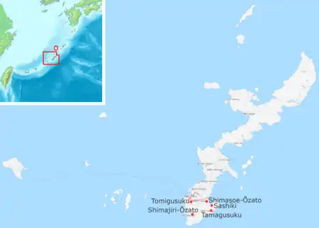The Chūzan Seikan identified the King of Sannan as Aji (local ruler) of Ōzato, who supposedly subjected to his rule Sashiki, Chinen, Tamagusuku, Gushikami, Kochinda, Shimajiri-Ōzato, Kyan, Mabuni, Makabe, Kanegusuku, and Tomigusuku. These place names as a whole roughly correspond to modern-day Shimajiri region. The notion of three powers appears to be deeply rooted in Okinawan society. However, it remains a matter of debate whether they corresponded to the later administrative divisions of Shimajiri (south), Nakagami (central), and Kunigami (north). Historian Ikemiya Masaharu pointed to the religiously oriented division of Okinawa, in which Shimajiri was not treated as a monolithic entity but was divided into the east and the west.[6] The non-homogeneity of Shimajiri is also confirmed by archaeological findings. Based on material culture, Archaeologist Asato Susumu divided Shimajiri into five regions.[7]