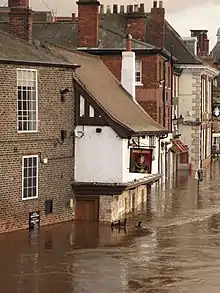 The pub floods, on average, four times a year, and does not hold flood insurance. Historically, it would remain open for regulars even when flooded, but this is no longer permitted, as the river water may be contaminated. In 1982, the brewery put a new flood protocol in place. A flood gate is put across the front door, and customers are served in the back bar. Once the flood waters reach the back door, the pub is closed, and all the fixtures and fittings can be dismantled and stored upstairs. The beer and electrics are all upstairs and so are not damaged even by floodwaters 4.5 metres above usual river levels. A chart on the wall marks historic flood heights, the highest being 2000, when floodwater nearly reached the ceiling of the bar.[5]