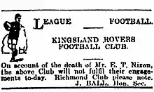 On 13 May a notice was published in the New Zealand Herald that Kingsland would be unable to fulfil their fixtures owing to the death of Edgar Thomas Nixon. The notice was published by their honorary secretary J. Ball.[20] Nixon had attended Auckland Grammar School and was a well known sportsman from a young age. He represented the school's 1st XI cricket team and 1st XV rugby side before playing senior cricket and rugby for Grafton. He died from typhoid due to the epidemic, and his funeral was on a Saturday and attended by large numbers of sporting organisations and athletes including members of the Kingsland league sides who likely knew him well as he lived in Kingsland.[21][22]