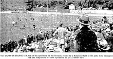 Kingsland finished with a 6 win, 6 loss record in the B Division to finish 3rd however they began to struggle for playing numbers late in the championship. In a loss to Otahuhu on 25 August they only had 8 players and the following week they defaulted to Parnell.[64] In the first round of matches the referee (Mr. Hill) in the Otahuhu v Kingsland game stopped play early and awarded the game to Kingsland due to the rough play of the Otahuhu side. There were several fights during the match and the referee had difficulty keeping spectators off the field. According to the writer in the NZ Herald this “was not the first time the spectators at Otahuhu had made trouble, and they were really the cause of the players getting out of hand”.[65] They were defeated by Grafton Athletic 18–10 in the semi final on 22 September.