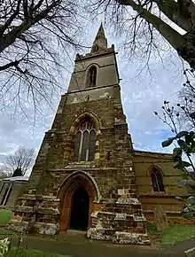 The west tower and recessed spire are 14th-[24] or 15th-century.[22] The tower has a ring of six bells. Robert Atton of Buckingham cast the second bell in 1621 and the fifth bell in 1622. Henry I Bagley of Chacombe cast the tenor bell in 1671 and Henry II Bagley cast the third bell in 1680. Alfred Bowell of Ipswich, Suffolk cast the treble and fourth bells in 1911.[25]