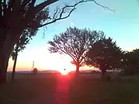 Within and around the area, at least 15 volcanic eruption points formed small cones. The eruptions produced deposits of scoria, ash, and tuff near these cones. In between eruptions, clay layers formed between the basalt flows.[2] Mount Kooroocheang, known locally as Mount Smeaton, just north of Kingston, is the largest volcano in the Uplands, rising 200 m above the plain to an elevation of 676 m. Young cones near Ballarat, Mount Warrenheip and Mount Buninyong, are visible from Spring Hill.