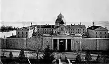 The site was chosen for "combining the advantages of perfect salubrity, ready access to the water, and abundant quantities of fine limestone."[2] Six inmates were accepted when the penitentiary was opened.[2] English author Charles Dickens visited Kingston in 1842 and commented in his American Notes: "There is an admirable jail here, well and wisely governed, and excellently regulated, in every respect. The men were employed as shoemakers, ropemakers, blacksmiths, tailors, carpenters, and stonecutters; and in building a new prison, which was pretty far advanced towards completion. The female prisoners were occupied in needlework."[3]