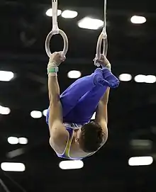 In artistic gymnastics, a kip is a technique that involves flexing or piking at the hips, and then rapidly extending the hip joints to impart momentum.[1][2] It may be performed in some form on all apparatuses, but is most commonly performed on the women's uneven bars[3] and on the men's rings, parallel bars, and horizontal bar.[4]