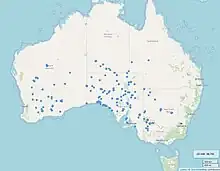 The species is widespread across South Australia and Inland in Western Australia from central regions to the South.[12][13] In Victoria north from Dimboola and chiefly to the West of Salt Lake. In the Northern Territory south of Alice Springs [14] and to the south and west of Mount Windsor Station in Queensland.[15] In New South Wales to the West and North-West of Weelah Forest (Condobolan area). There are also several records near Conoble in the Ivanhoe Distsrict.[16][17]
