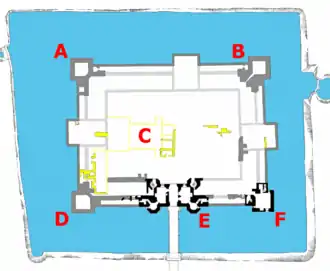 The 15th-century castle is rectangular in shape, 245 by 175 feet (75 by 53 m) across, similar in design to Farleigh Hungerford Castle in Somerset or Baconsthorpe Castle in Norfolk.[36] Although incomplete, the surviving elements and the foundations show that it was designed with a square tower on each corner, with less substantial side towers on the north-east, south-east and south-west edges, and a large gatehouse on the north-western side.[37] An inner range of buildings, 17 feet (5.2 m) deep, ran around the inside of the curtain wall, set back slightly from the wall itself and forming a central courtyard.[38] The towers projected 6 feet (1.8 m) into the water-filled moat which surrounded the castle.[39]