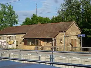A relay interlocking of Dr L2 type[10] was located in the station building and controlled the station's two through tracks, as well as the two marshalling yards with a loading ramp north and south of the line. It was put into operation in 1956 and has been remotely-controlled from the Saarbrücken control centre since 1 September 1972. Operations were directed by an on-site dispatcher, who implemented the control commands sent from the control centre. The signal box was no longer occupied from 1 September 1982 and direct control of the signalling and points was assumed by the Saarbrücken centre. When the electronic interlocking in Saarbrücken was commissioned in October 1998, the relay interlocking was taken out of service. Since November 2003, the dispatcher responsible for local operations has been located in the Karlsruhe operations centre. The decommissioning of the signal box and the changeover to the electronic interlocking also resulted in the reclassification of the station from a full station (Bahnhof) to a halt (Haltepunkt).[10] Until the beginning of the 1970s, the on-site dispatcher was responsible for ticket sales.