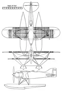 Each 21 ft 3 in (6.48 m) long and 40 in (1,000 mm) wide plywood float had a concave V-bottom, with a single step 10 ft 6 in (3.20 m) back from the nose. Each float was mounted on two steel struts, enclosed in dural sheet fairings. The forward strut was joined at the side of the engine mounting and the rear one met its opposite partner on the fuselage underside centre-line. Diagonal struts from the feet of the forward struts on the float joined the top of the rear struts to provide cross-bracing and two horizontal struts connected the floats together.[1][2]