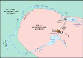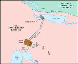 Other than the legal objection, Pakistan also had concerns that the project would affect the flow of waters into Pakistan-administered Kashmir along the Kishanganga riverbed, impacting agriculture in "thousands of acres" as well as Pakistan's own planned Neelum–Jhelum project downstream.[11] Experts estimated that the impact on the Neelum–Jhelum project would be only about 10 percent,[14] because 70 percent of the waters of Kishanganga/Neelum are generated within Pakistan-administered Kashmir (after passing through the Kishanganga project)[15] and the project itself reduces the flow by only 21 to 27 percent.[14][note 1]