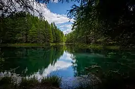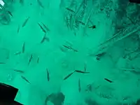 In the crystal clear waters of the spring, ancient tree trunks with mineral-encrusted branches can be seen, as well as fish.[4] Fish species commonly present in the spring are lake trout, brown trout and brook trout. On occasion, one may spot yellow perch and other species that move between Big Spring and Indian Lake.[1]