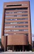 In the 1990s, during the mayoral term of Dom Cardillo, the city decided that it should operate from a dedicated, modern building again. It purchased the complete block enclosed by King, College, Duke, and Young streets, and held an architectural competition to design the building. The winner was Toronto architects Kuwabara Payne McKenna Blumberg Architects (Mertins & Wright, 1990) who laid out an open square facing King Street complete with a fountain/skating rink. The design plans for the building are kept at the Canadian Centre for Architecture in Montreal.[1] The Kitchener City Hall is enclosed on two sides by three-storey wings, with the main building at the back of the square. The west side of the edifice houses the council chamber; a central, open rotunda defines an indoor public space, and the east elevation consists of a twelve-storey office tower.