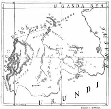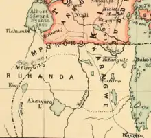 Uganda and Rwanda (1898) showing Mufumbiro mts between Lakes Albert and Kivu. Lake Kivu is in fact much larger.[lower-alpha 2]