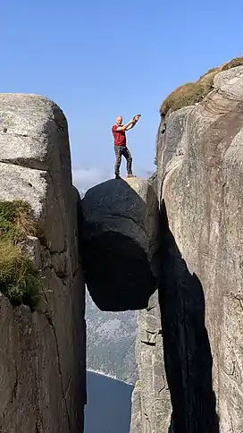 Kjeragbolten (English: Kjerag Bolt) is a boulder on the mountain Kjerag in Sandnes municipality in Rogaland county, Norway. The rock itself is a 5-cubic-metre (180 cu ft) glacial deposit wedged in a large crevice in the mountain. It is a popular tourist destination and is accessible without any climbing equipment. However, it is suspended above a 984-metre (3,228 ft) deep abyss. It is also a popular site for BASE jumping. The boulder is just southwest of the village of Lysebotn, just south of the Lysefjorden.[1]