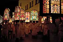 The procession is organised in six stages. First come men cracking long two-handed sheep whips. Next come men wearing Iffelen or Infuln, which are enormous, incredibly ornate paper hats which resemble a cross between a bishop's mitre and a stained glass window, lit from the inside by candles, and as much as seven feet tall. Behind them is St. Nicholas himself, with four attendants in black robes and hoods known as Schmutzlis, who hand out pastries. After them comes a brass band playing the traditional Klaus song, followed by a large group ringing trycheln, large bells which are descendants of cow bells. Lastly, the entire procession is followed by men blowing cow horns.[2] Participants and watchers then generally head on to celebrations in local taverns.