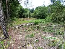 Kleč was a Gottschee German village. In the land registry of 1574 it had four full farms divided into eight half-farms, corresponding to a population between 35 and 40. In the 1770 census there were 23 houses in the village.[9] Kleč had a maximum population of 125 in 1880, which gradually decreased due to emigration.[10]: 14 Before the Second World War, the village had 21 houses and a population of 89. At that time, the economy of the village was based on farming, making wooden tubs, troughs, shovels, and railway ties, selling firewood, lumber, and logs, and gathering berries. There was an inn in the settlement.[4] The original inhabitants were evicted on 23 and 24 November 1941.[10]: 14 In August 1942 Italian troops burned the village and now it is difficult to discern the traces of the former houses.[11] The village was not rebuilt after the war, and the meadows were used by the Kočevje collective farm. Since about 1990 the farmland has been worked by the Robida family of Stari Log.[10]: 14–15 A sign with information about the village in Slovenian, German, and English was erected at the site of the former church in 2012.[10]: 16