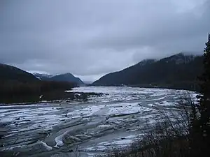 The Klehini River is about 42 miles (68 km) long from its source in British Columbia to its mouth at the Chilkat River,[2] of which it is the largest tributary. The Klehini River is renowned for its salmon runs, its biannual congregation of bald eagles—the second largest in the Haines area after the Chilkat River's Council Grounds—and for the Klehini Falls. The Klehini also delineates the northern boundary of the Chilkat Range.