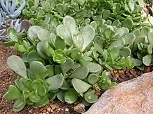 Kleinia petraea is a species of flowering plant in the genus Kleinia and family Asteraceae which was previously considered to be a species of Senecio.[5] Native to Kenya and Tanzania, it is colloquially known as creeping jade, trailing jade or weeping jade due to its resemblance to the unrelated Jade plant (Crassula ovata). It is grown as a garden plant as a groundcover or in hanging baskets.