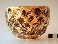 Settlement pottery of the Alanic period has been found on the southern and northern slopes, and on top of the rock. Alanic graves of the 5th – 7th/early 8th centuries AD are located on the southern slope (cemetery III), with further graves of the 7th/early 8th centuries AD on the northern slope (cemetery IV). The standard grave type is a large catacomb with an entrance corridor (dromos), usually with several burials in the chamber. The burial ritual is basically the same as in the Sarmatian period, but with a wider range of grave-goods and with more elaborate ritual (horse sacrifice, pottery depositions and traces of fire in the dromoi). Finds of special interest include a Central Asian type of sword with P-shaped scabbard fittings (Grave 360), an Iranian glass bowl (Grave 360), and gold coins of the Byzantine emperors Tiberius Mauritius (Maurice (emperor)) and Heraclius (Graves 341 and 363).[5]