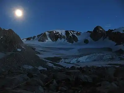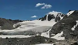 Klondike Peak (13,120 ft (4,000 m)) is located in the northern Wind River Range in the U.S. state of Wyoming.[3] Situated 4 mi (6.4 km) north of Gannett Peak, Klondike Peak is within the Bridger Wilderness of Bridger-Teton National Forest and west of the Continental Divide. The summit of Klondike Peak is partially capped by a small glacier and the northwest flank of the peak is the origination point of J Glacier, while Sourdough Glacier lies just to the northeast.[3] Klondike Peak is the 26th tallest peak in Wyoming.[4]