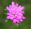Its flowers are united into so-called calathidium inflorescences, that are surrounded by lanceolate involucral leaves. Each zygomorphic flower consists of four floral leaves, with petals being scarlet, scarlet red, purple and in rare cases even white. The plant's sepals are reduced into very short and pointy flower bristles, that are usually in groups of 8. Knautia drymeia has so-called inferior ovary, with flower elements being set above it.[3]