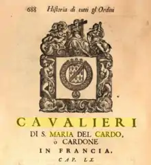 The Knights of Cardone were a Medieval order of chivalry. They are noted for their role in the Siege of Negroponte (1470).[1] Under the Venetian command of Admiral Pierre d'Aubusson the Knights of Cardone prepared for battle against Ottoman forces led by Mehmed II.[1] Unfortunately Venetian General Nicolo da Canale lost his nerve and ordered d'Aubusson to retreat which resulted in the loss of Negroponte, and the island of Euboea.[1] Subsequently, during the Siege of Rhodes (1480), d'Aubusson and his Knights successfully defended against another Ottoman attack by Mehmed II.[2]