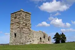Knowlton Church is a ruined building of unknown dedication standing near the centre of Church Henge. The earliest parts of the building are the 12th-century chancel and nave and there are 15th and 18th century additions and alterations.[2] The church was in use in 1550, however lack of use led to calls to demolish it in 1659.[2] But it saw a revival after this time, and a north aisle was built in 1730. Later in the 18th century the roof fell in and the church was abandoned.[2] The church is a Grade II* listed building.[3] The nearby Victorian-built Church of the Ascension at Woodlands has a 12th-century circular stone font originally from Knowlton Church.[2]