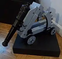 Koehler's design had the further advantage of absorbing the recoil caused by firing the gun.[1] Ordinary carriages had no mechanism to absorb this recoil. The entire gun and mount would jump violently, causing the gun crew to have to reposition it before they could fire the next shot.[6] Koehler's carriage mounted the gun on a sliding bed attached to the main body of the carriage via a vertical spindle. Firing the cannon forced the bed to slide upwards, rather than making the entire carriage recoil.[1] As an eyewitness, John Drinkwater, noted, "the carriage, when the gun was depressed, seldom moved; the gun sliding upon the plank to which it was attached by the spindle, and returning to its former place with the most trifling assistance."[5] This system was a forerunner of the recoil systems that are standard features of modern artillery pieces.[7] The gun could be reversed on the carriage and fired upwards at angles of up to 45°, though according to Drinkwater "in that state [it] did not particularly excel."[5] The design also enabled gunners to reload the cannon without exposing themselves to enemy fire, by rotating the sliding bed sideways.[1]