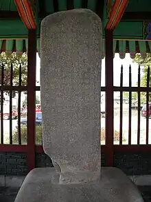 A small number of inscriptions have been found in Goguryeo territory, including the Gwanggaeto Stele (erected in Ji'an in 414), four inscriptions on the walls of Pyongyang Castle, and a stele in Jungwon, Chungju (590s).[37] All are written in Chinese, but some of them contain irregularities, including a few examples of object–verb order (as found in Korean and other northeast Asian languages) instead of the usual Chinese verb–object order, and some uses of the characters 之 and 伊, which some authors have connected to their use to represent Korean particles in later Idu texts from Unified Silla.[38][39]