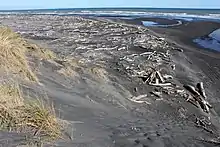 About 8 km (5.0 mi) south of Koitiata[12] the 404 ton, iron barque, Fusilier, was blown onto the coast on 16 January 1884.[13] She was 24 years old[14] and had been sailing in ballast from Wellington to Adelaide.[15] Attempts to refloat her[16] were abandoned[17] The Fusilier is now in the sand dunes, about 200 yd (180 m) from the highest tides.[18]
