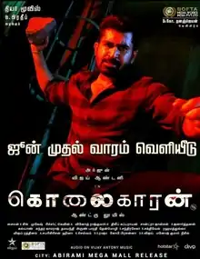 Kolaigaran (transl. Killer) is a 2019 Indian Tamil-language action thriller film[2][3] directed by Andrew Louis of Leelai fame.[4] The film stars Vijay Antony, Arjun and Ashima Narwal, while Nassar and Seetha play supportive roles. The music is scored by Simon K. King.[5] Principal photography of the film commenced on 5 June 2018.[6][7] The film follows an investigation in which a woman and her mother are suspected of murder after a disfigured corpse is found, while their neighbor claims to have committed it instead, much to the surprise of cops. The film was released theatrically on 7 June 2019. It opened to positive reviews and became a super hit at the box office.[8]