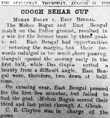 In 1920, the Jora Bagan club took field against Mohun Bagan who chose play without their star halfback Sailesh Bose, much to the chagrin of club vice-president Suresh Chandra Chaudhuri.[10] Such was the industrialist's displeasure, he decided to form a new club and East Bengal was born. As Chaudhuri and his co-founders hailed from eastern part of Bengal, essentially now modern-day Bangladesh, the club became an identity for the people who migrated from that region during the partition of Bengal. This resulted in the clubs being backed by two different socioeconomic groups, although this has largely changed over period of time. The first ever clash happened on 8 August 1921 in Cooch Behar Cup semifinal which ended in a goalless draw. Mohun Bagan would win the following replayed match on 10 August 1921 by defeating East Bengal 3–0, courtesy to the goals from Rabi Ganguly, Paltu Dasgupta and Abhilash Ghosh. But due to tournaments like this not regarded as official events and Calcutta Football League being the only official competition, the first official meeting is considered to be the CFL match-up held on 28 May 1925 at the Calcutta Football Ground (now Mohun Bagan Ground) where East Bengal won 1–0 with the help of a solitary goal from Nepal Chakraborty.