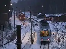 At Øraker the Lilleaker Line meets the Kolsås Line, after which point the lines share tracks.[3] The line crosses the municipal border across the river Lysakerelven. The now closed station of Lysakerelven, 8.4 kilometers (5.2 mi) from Stortinget, was situated on the Bærum side of the municipal border between Oslo and Bærum.[4] At Jar there are two sets of platforms, one for the metro and one for the trams. The continues past Ringstabekk, which is only served by the metro. It replaced three disused stations, Tjernsrud, Ringstabek and Egne hjem.[3] Situated 11.4 kilometers (7.1 mi) from Stortinget,[4] Bekkestua is the terminal station for the tramway, and a major transit hub for central Bærum. Like Jar, it features two sets of different platforms. The shared rail section features both third-rail power supply and overhead wires. The trams have a narrower loading gauge and shorter platforms, making it necessary to provide separate platforms for them.[3]
