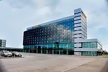 Terminal A completed construction in 2007. It is used solely as a departures and arrivals facility for domestic flights. The terminal was 19,600 m2 and had a capacity of 1,000 pax/hour. Later the 2005 International terminal was joined to Terminal A, making the total area of the terminal 35,000 m2 and the capacity of 1600 pax/hour.[13] The terminal is 2 floors in height. The ground floor contains check-in desks, baggage claim areas (with carousels), currency exchange centers, a staff room, and several coffee shops. The second floor has several restaurants, including Grenki Pub, a children's nursery room, and the domestic business lounge which opened on 13 June 2013. The lounge is accessible by passengers with business class tickets or for a fee of 1960 rubles.[14] The terminal has 5 jet bridges and several other bus gates. renovations to the domestic terminal were made as early as of 18 February 2014, with the stylistic and congestion reductional changes.[15] The renovations began in 2012 with NefaResearch design studies winning the bid for the reconstruction, with Phase I completed on 27 December 2012, and Phase II on 18 February 2014.[16] The total price of the renovations was listed at 141,000,000 rubles.